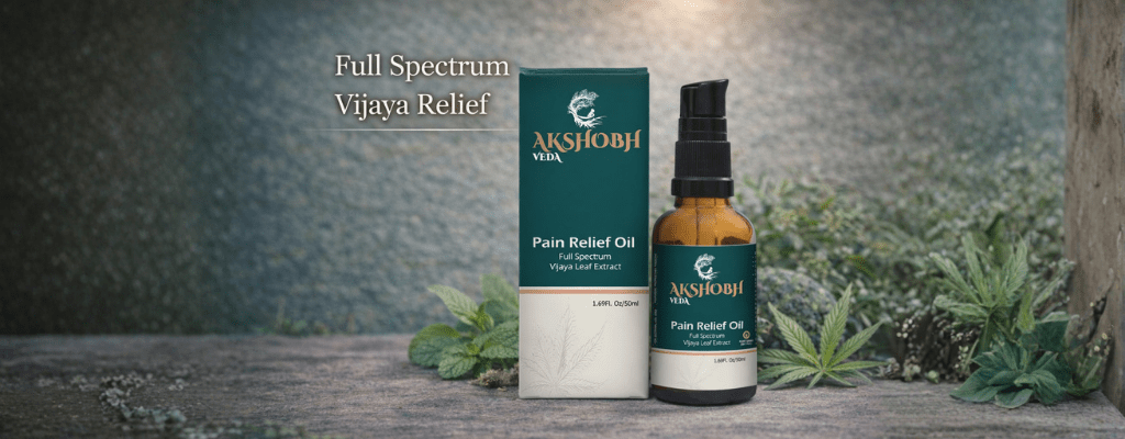 Akshobh Veda Pain Relief Oil with natural cannabis leaf background, highlighting plant-based support for knee pain relief and improved joint mobility.