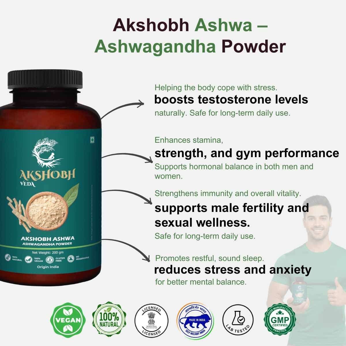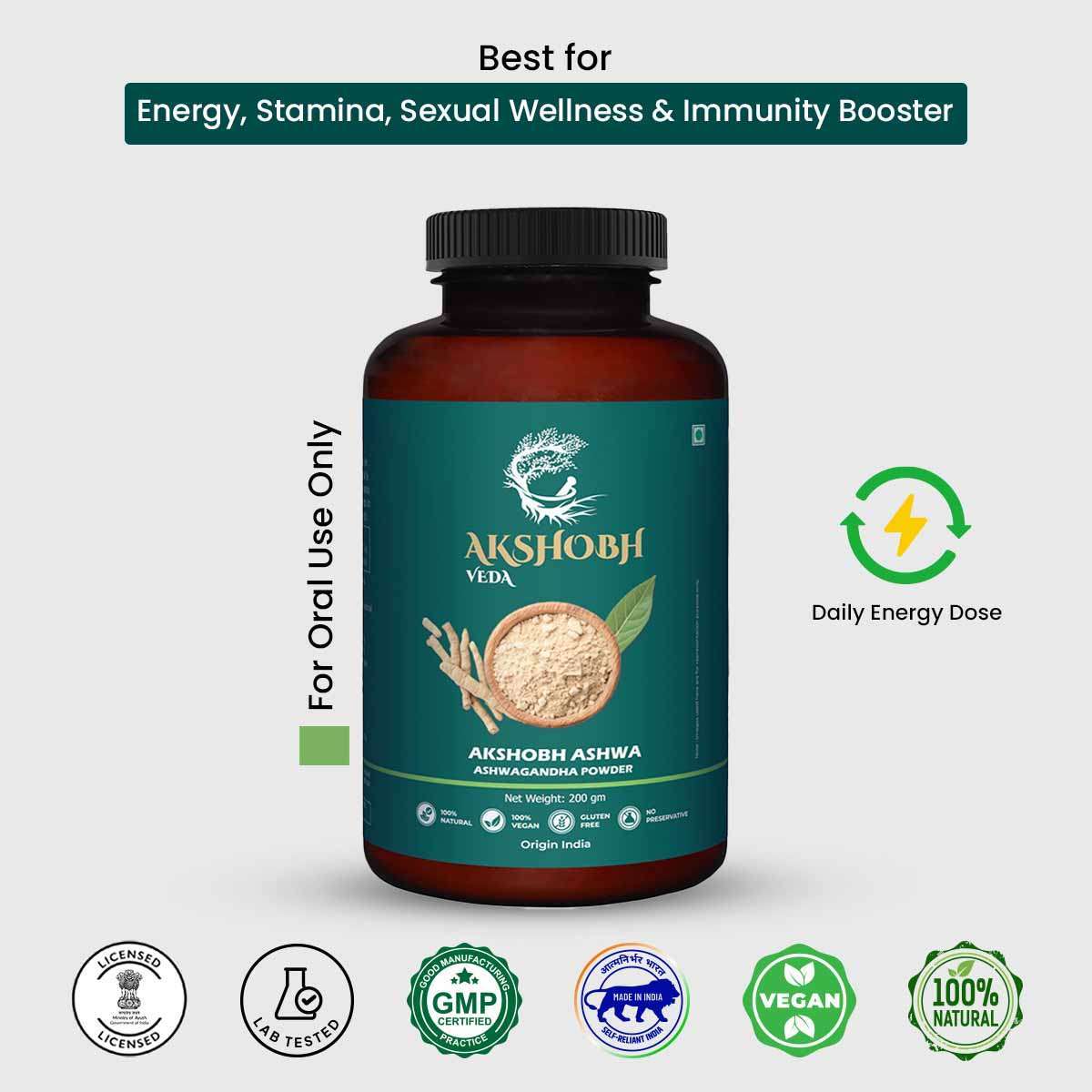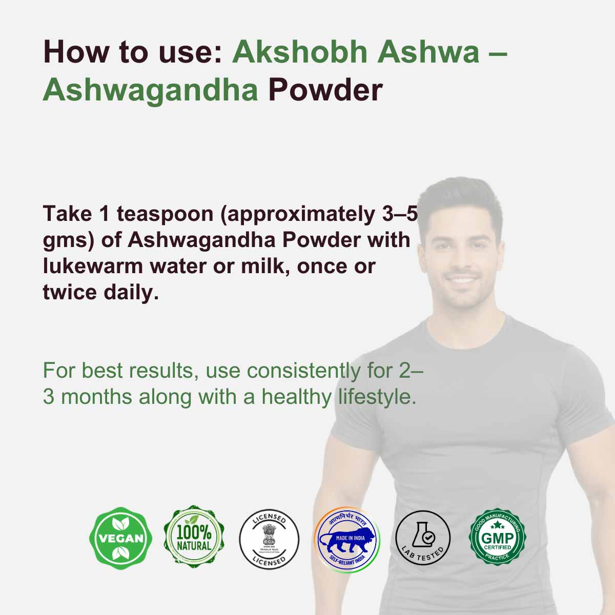 - Take 1 teaspoon (approximately 3–5 gms) of Ashwagandha Powder with lukewarm water or milk, once or twice daily.