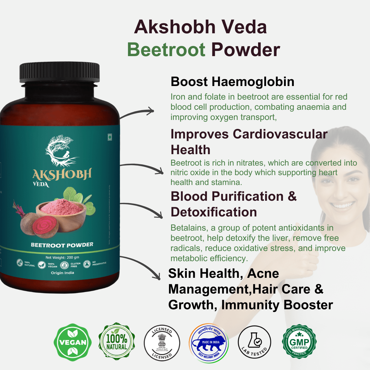 - Promotes clear, healthy skin by reducing pimples, acne, and inflammation while adding a natural glow.