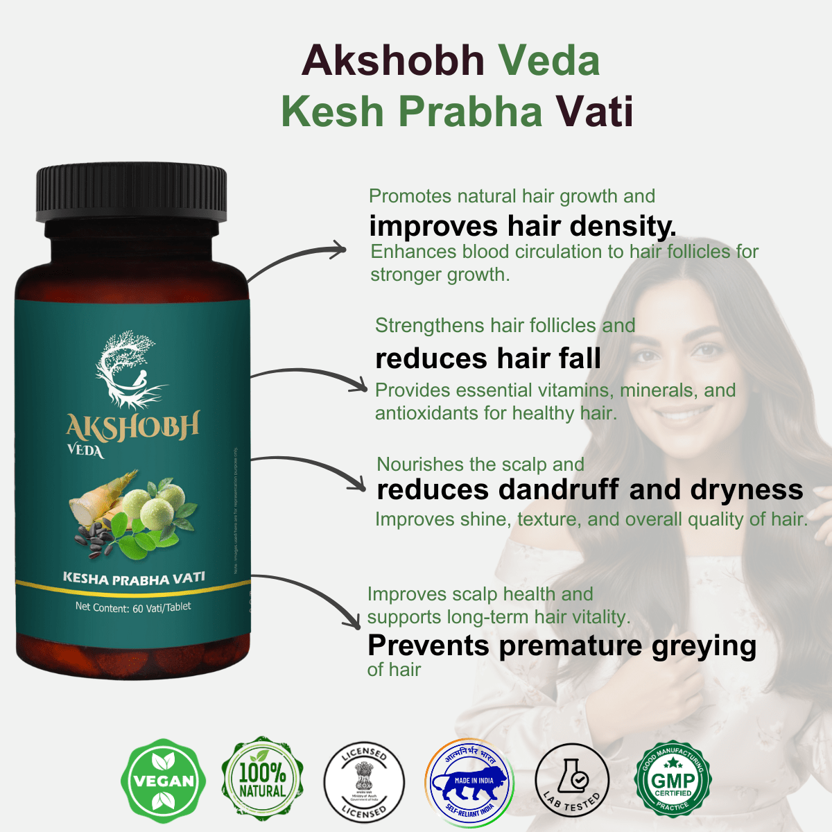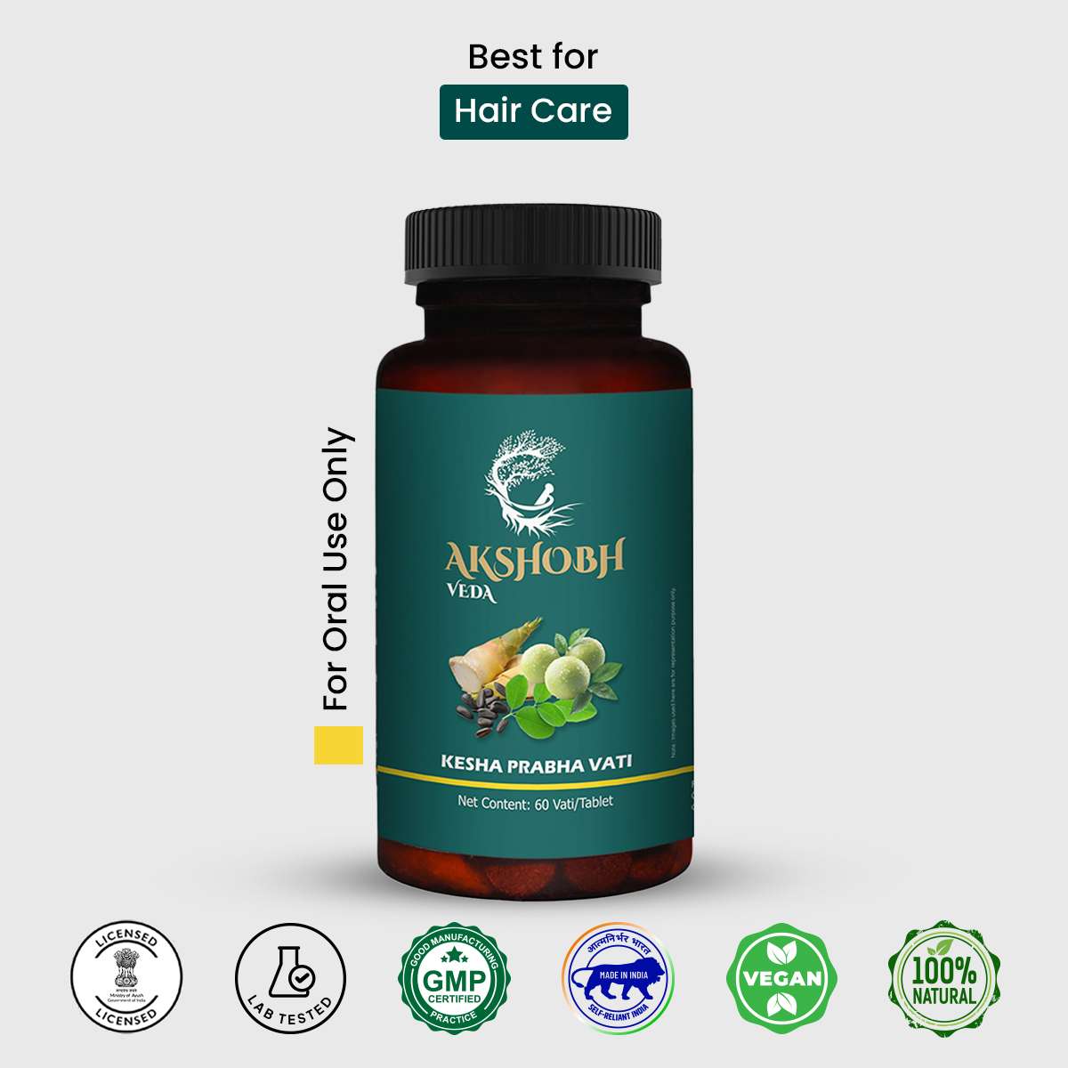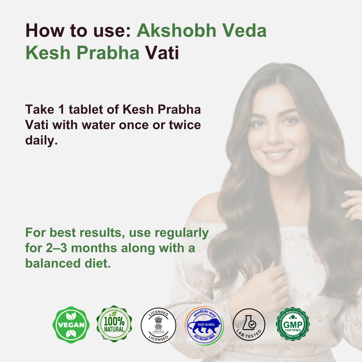 - Take 1–2 tablets of Kesh Prabha Vati with lukewarm water once or twice daily.