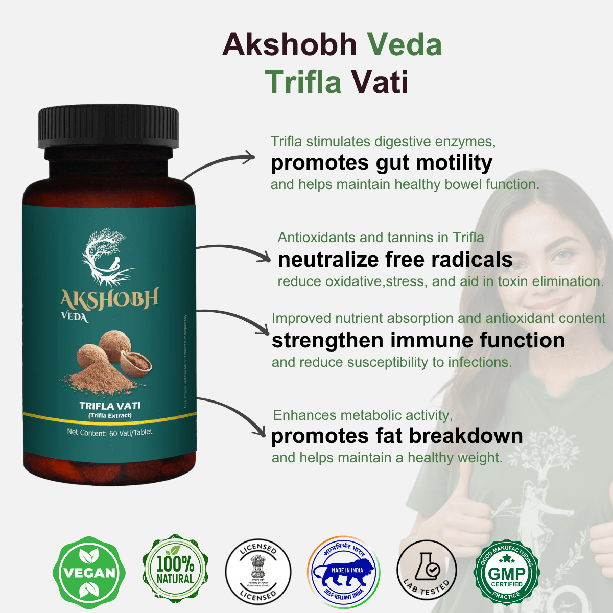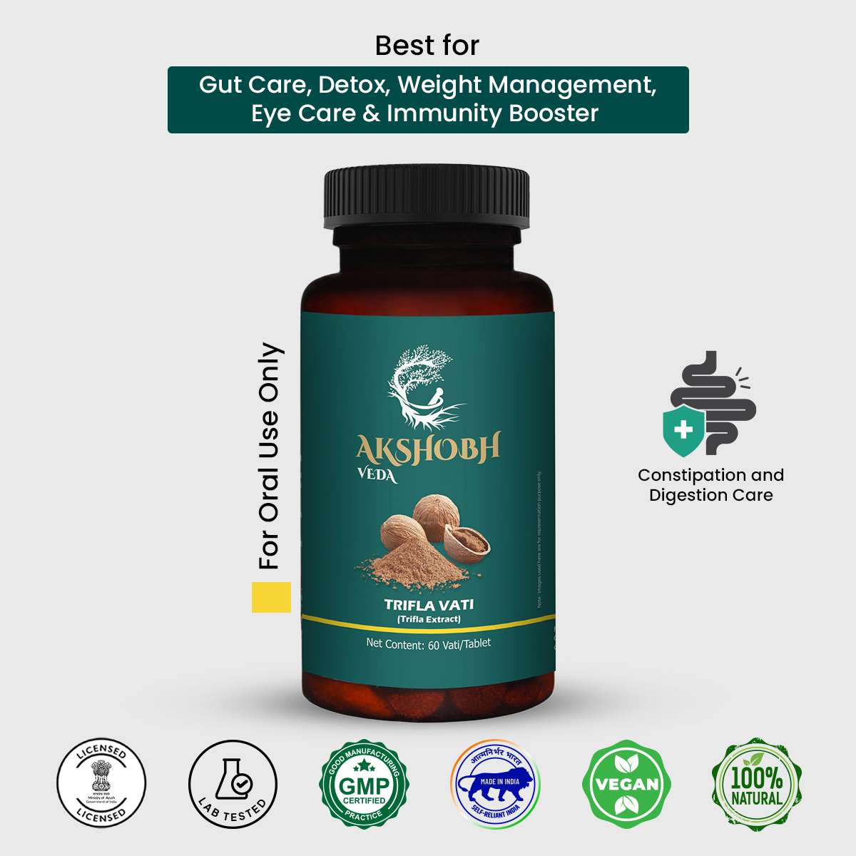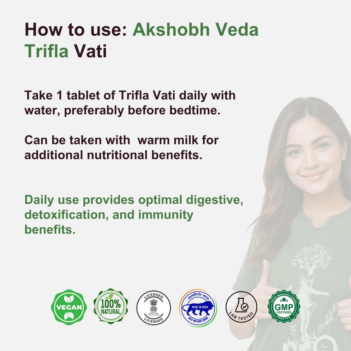 - Take *1–2 tablets of Trifla Vati* with lukewarm water, preferably before bedtime or as directed by your physician.