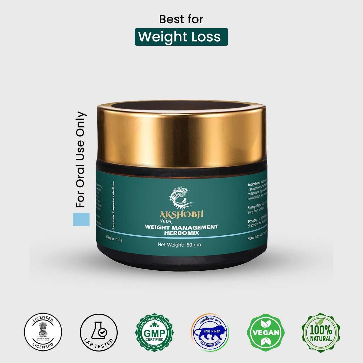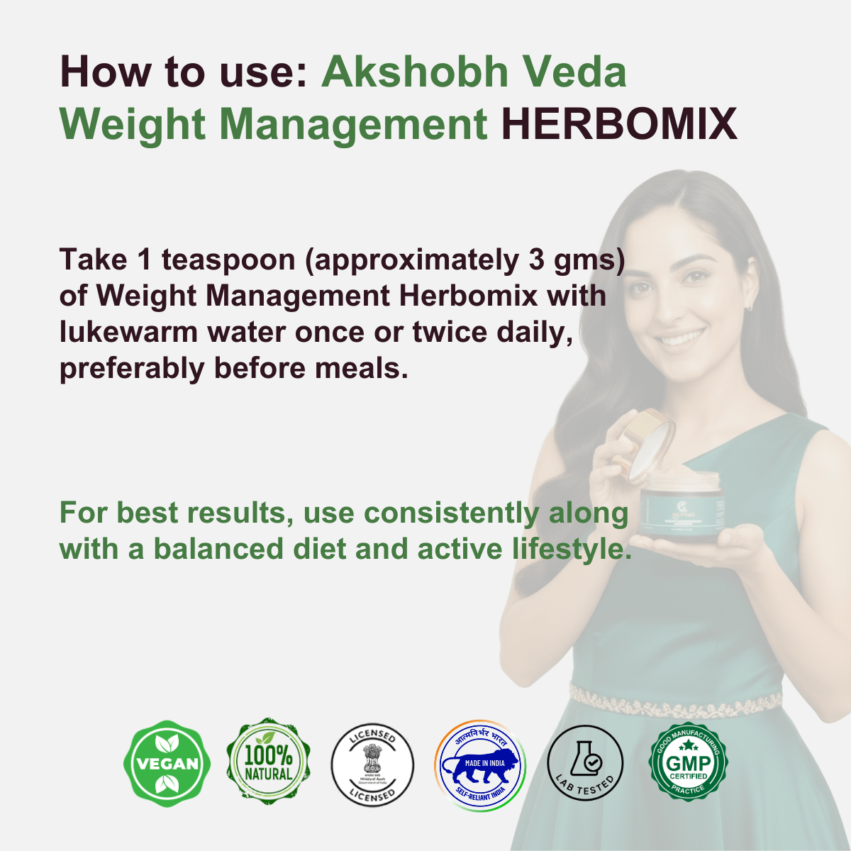 • Take 1 teaspoon (approximately 3 gms) of Weight Management Herbomix with lukewarm water once or twice daily, preferably before meals.